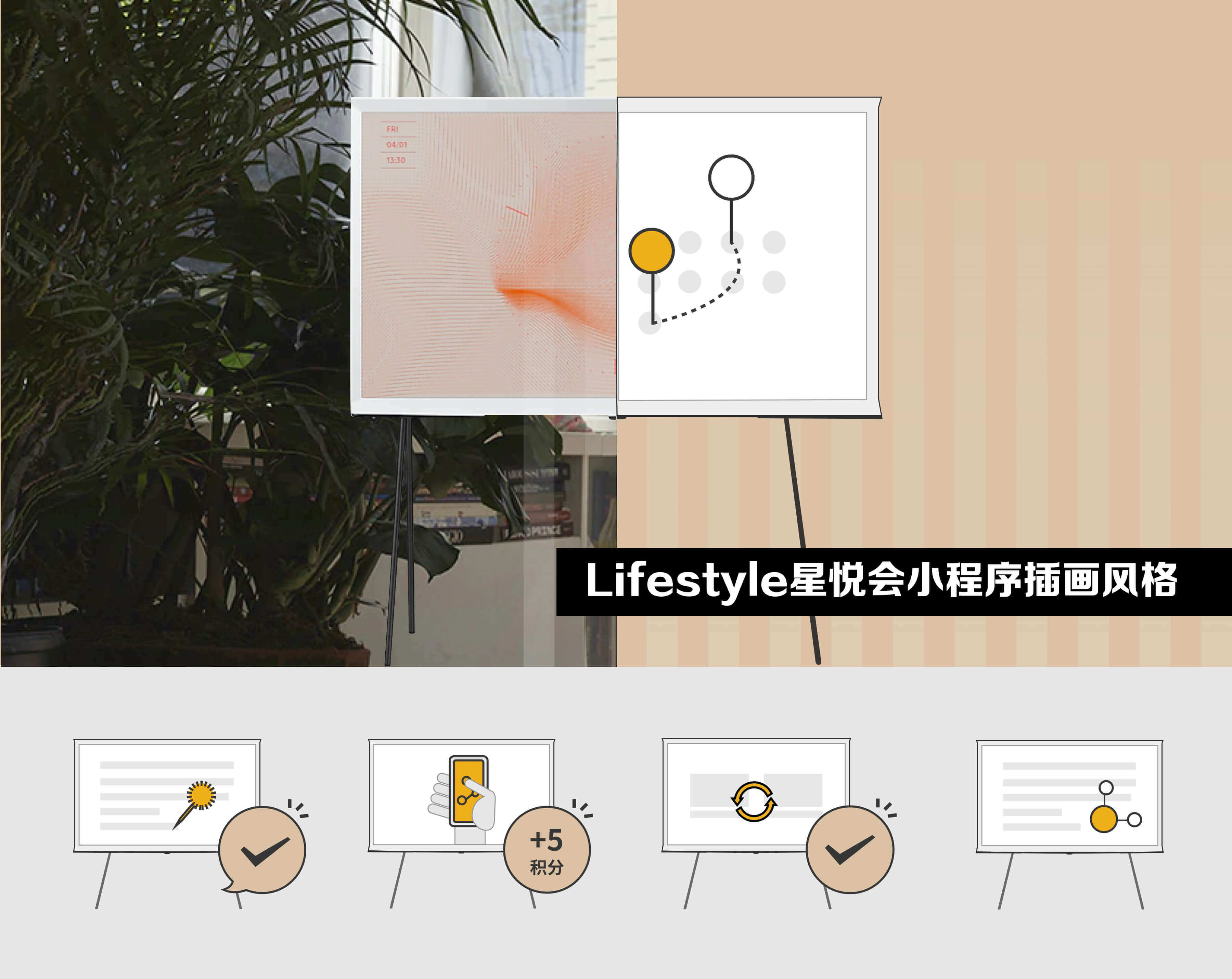 插画采用细线条进行勾勒,与三星电视精细优雅的产品调性保持一致。经得住多角度欣赏细节之美,呈现出简约不简单的高级品质感。以醒目的黄色icon提示重点信息, 保持简洁的同时区分出内容的主次轻重。